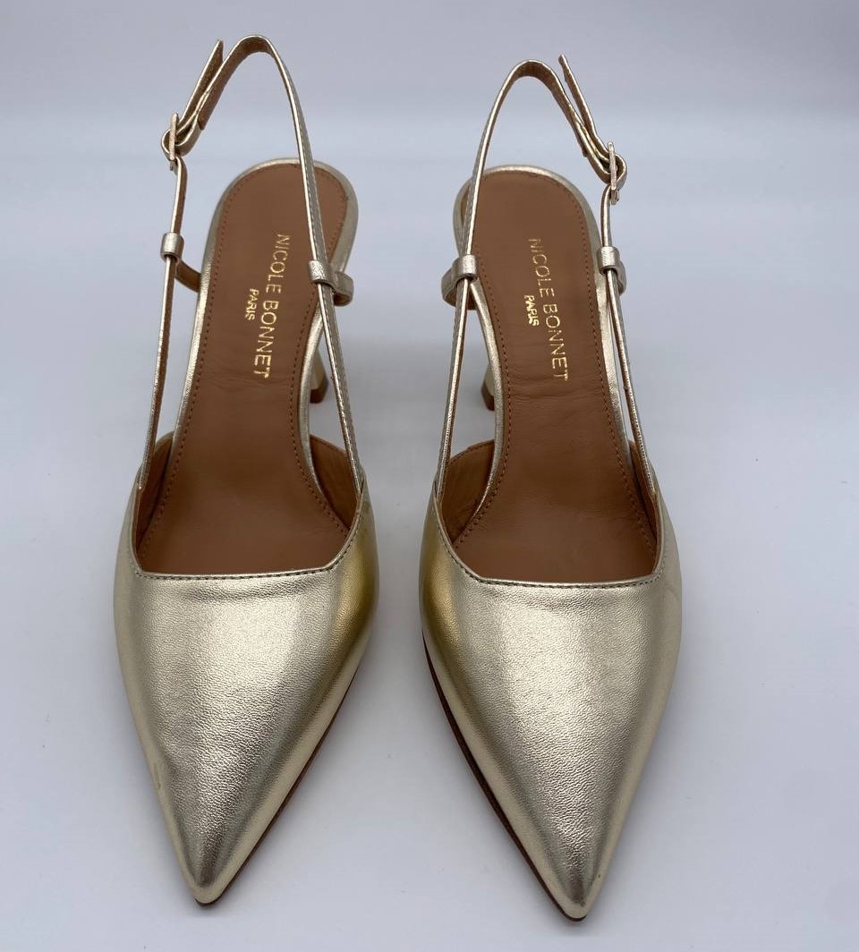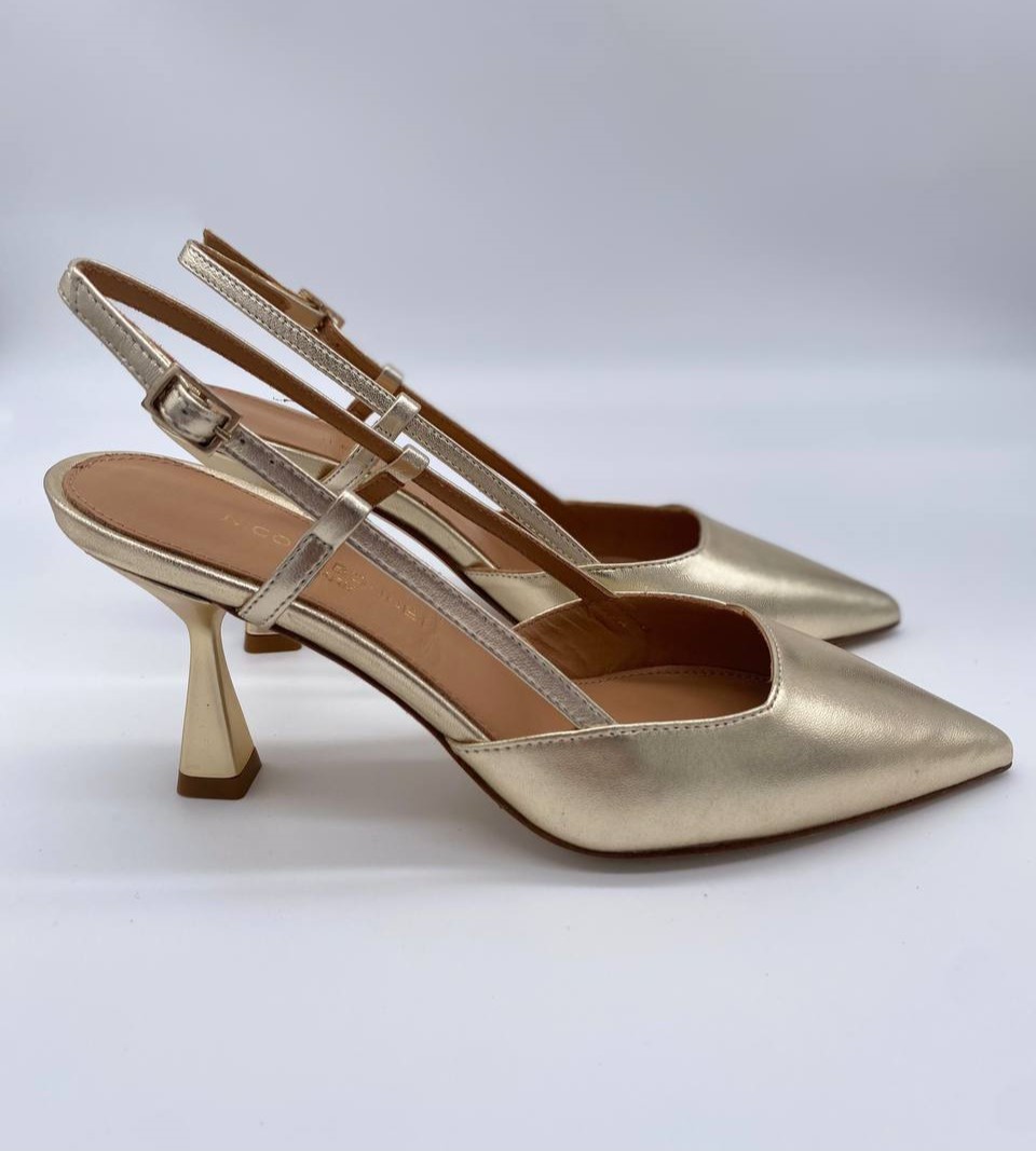 Chanel laminato platino. Chanel realizzata in pelle laminato platino con scollo quadro e cinturino con alette laterali. Il tacco 70 a rocchetto assicura una camminata adatta per occasioni e fornisce eleganza esaltando la silhouette.