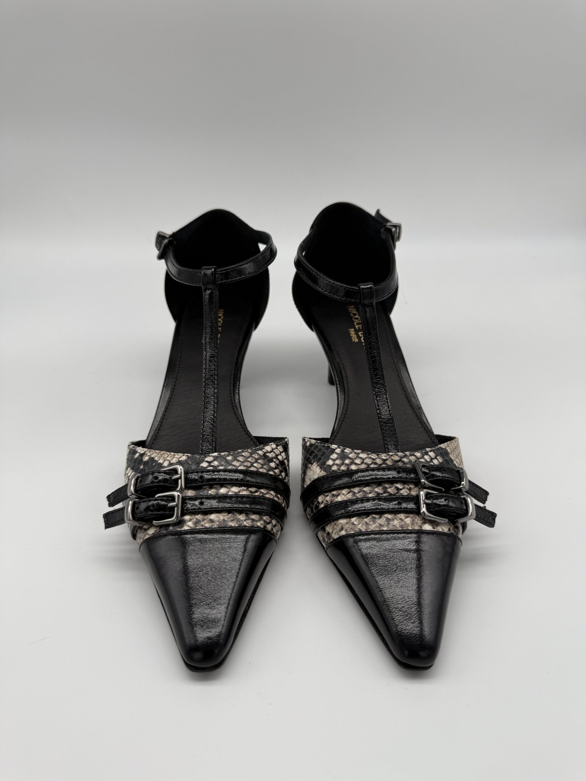 Chanel pitone tacco 50. Chanel realizzata con punta e tacco in pelle e stampa pitone bianco e nero con fibbiette. Presenta il cinturino alla caviglia regolabile con pippetta su accollo. Il tacco 50 a rocchetto garantisce un tocco raffinato con una calzata confortevole assicurando stabilità per accompagnarti con stile.