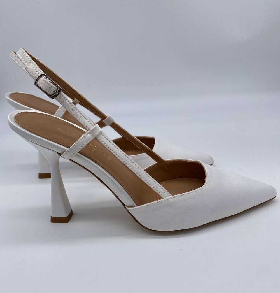 Chanel raso bianco. Chanel realizzata in raso bianco con scollo quadro e cinturino con alette laterali. Il tacco 90 essendo a rocchetto assicura una camminata stabile e comoda valorizzando la silhouette.