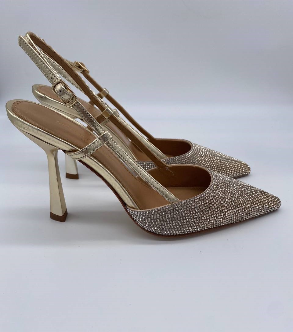 Chanel Swarovski platino tacco 90. Chanel realizzata in Swarovski platino con effetto sfumato sulla punta e scollo rotondo. Il tacco 90 essendo a rocchetto assicura comodità e stabilità e soddisfa la richiesta di una donna che cerca eleganza.