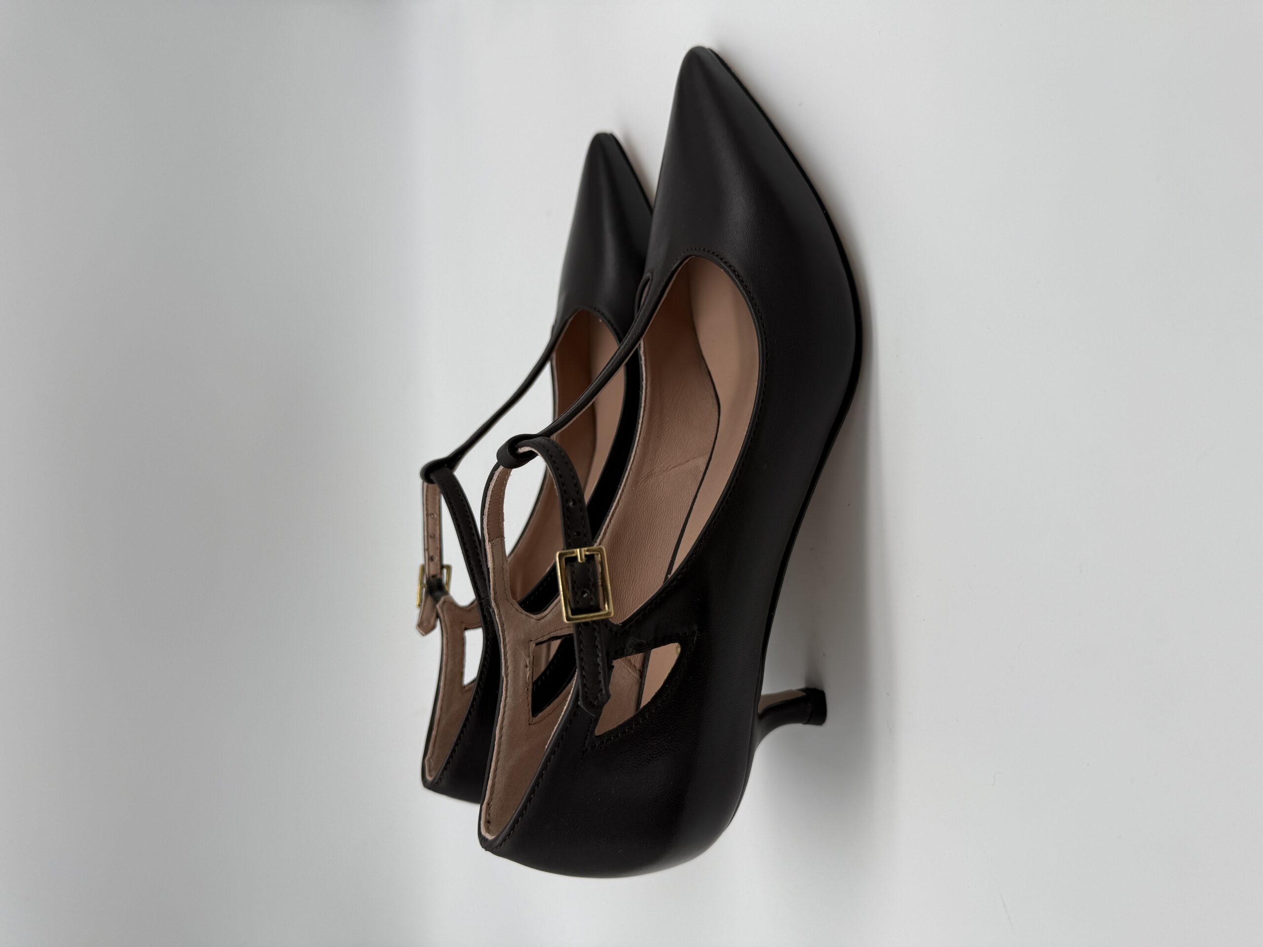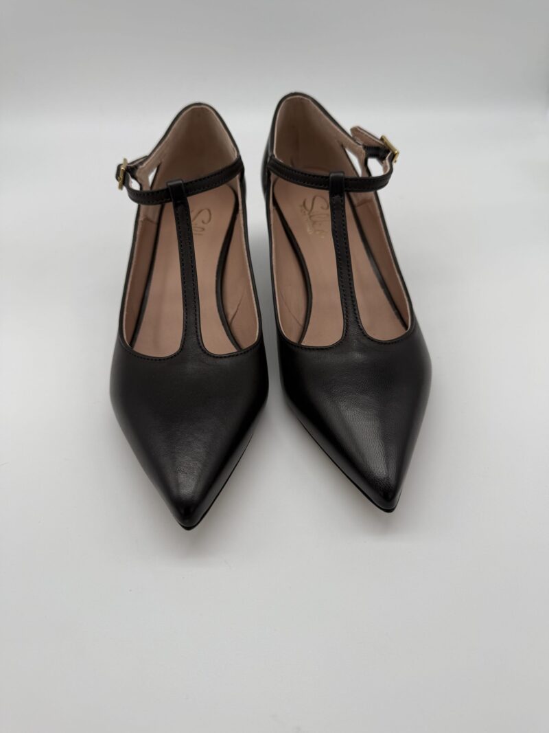 Décolleté cinturino tacco 50. Décolleté realizzato in pelle testa di moro con cinturino alla caviglia regolabile e pippetta centrale. Il tacco 50 a rocchetto assicura stabilità e comodità, la sua linea molto sfilata valorizza la silhouette.