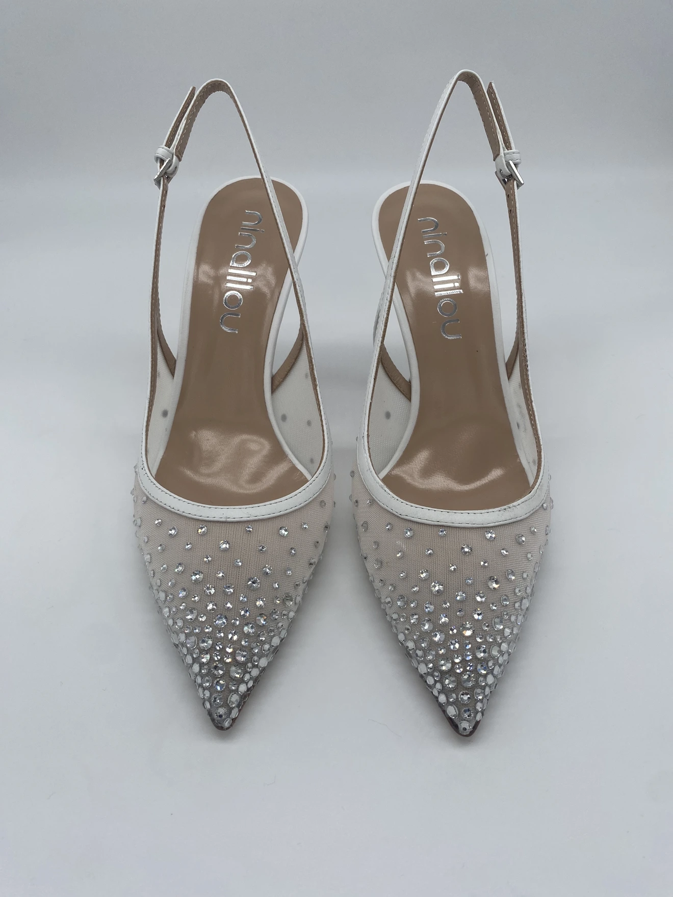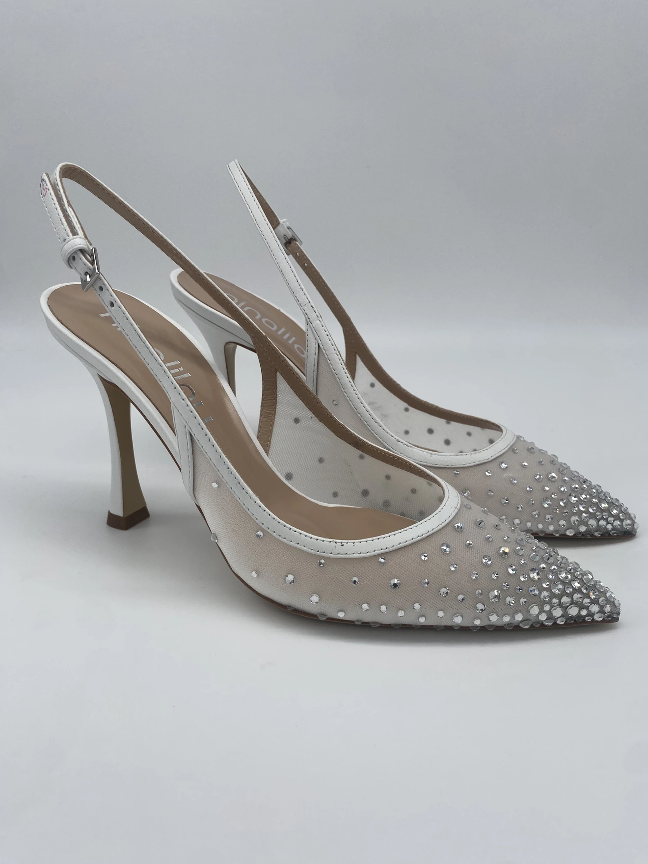 Chanel realizzata morbida rete bianca e applicazione di strass in punta. Il tacco 90 a rocchetto permette un confort maggiore per un design slanciato e luminoso.